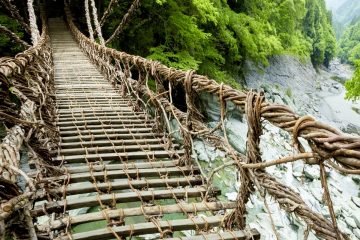 平家一族の哀話を秘める、秘境“祖谷”にあるかずら橋。シラクチカズラ(総重量約6t)で作られたもので、長さ45m・幅2m・水面上14m。 昔は深山渓谷地帯の唯一の交通施設であった。3年毎に架替えが行われる。(国指定重要有形民俗文化財)