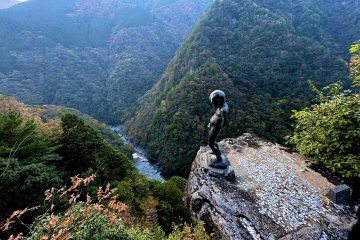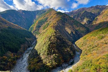 日本三大秘境のうちの一つ、秘境祖谷を代表する『祖谷渓谷』 。深く切り込んだV字型の渓谷には、エメラルドグリーン色の祖谷川が流れ、上から覗き込めば、目がくらむほどはるか下に見える。秋には谷底から峰まで全山紅葉します。