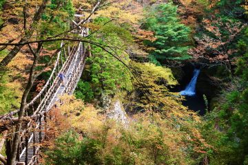 秘境の雰囲気が漂う美しい景観に囲まれたかずら橋。平家一族が剣山の「平家の馬場」に通うために架けられたといわれる橋で、男橋(おばし)と女橋(めばし)の二本あり、夫婦橋(めおとばし)とも呼ばれる.