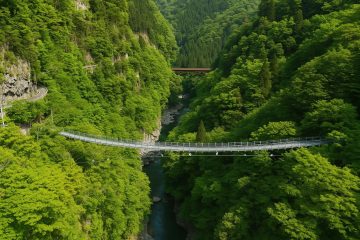 川底からの高さは約70mで歩くたびに少し揺れ、それでも望みたくなる秘境の絶景。渓谷の底を澄んで流れる祖谷川の風景をご覧ください。