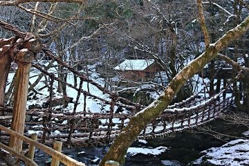 秘境の雰囲気が漂う美しい景観に囲まれたかずら橋。平家一族が剣山の「平家の馬場」に通うために架けられたといわれる橋で、男橋(おばし)と女橋(めばし)の二本あり、夫婦橋(めおとばし)とも呼ばれる.